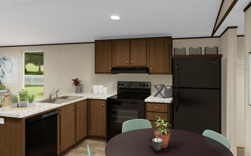 The Delight is a Tru manufactured home. This home is a 2 bedroom, 2 bathroom home. It is a 14x60 and 820 SQFT. This open-concept home features a large kitchen with more counter space, a full bathroom, and large living area.